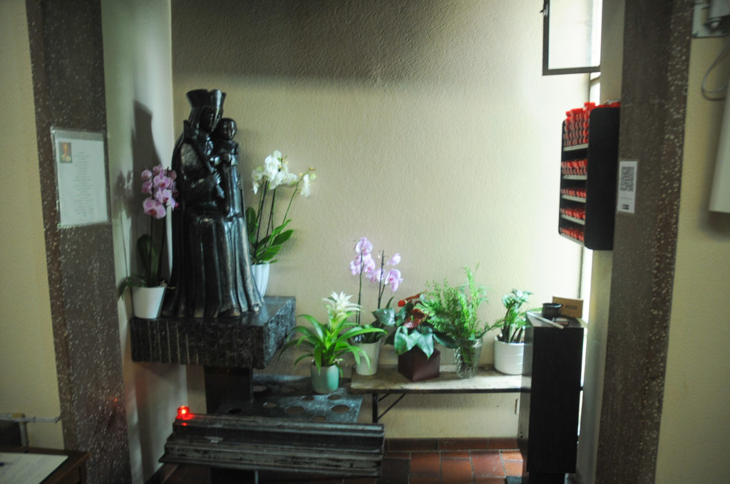 Dans l’un des coins de l’église, vous trouverez une Vierge à l’Enfant, aux pieds de laquelle vous pouvez déposer une bougie, symbole de la présence divine, puisqu’elle est une lumière dans l’obscurité. Sa flamme accompagnera ensuite vos intentions de prières ou bien vos intercessions pour des proches malades ou des défunts. Si besoin, vous pouvez lire la prière affichée à gauche de l’image. Pour payer pour la bougie, il suffit juste de scanner le Qr code à gauche de l’image.